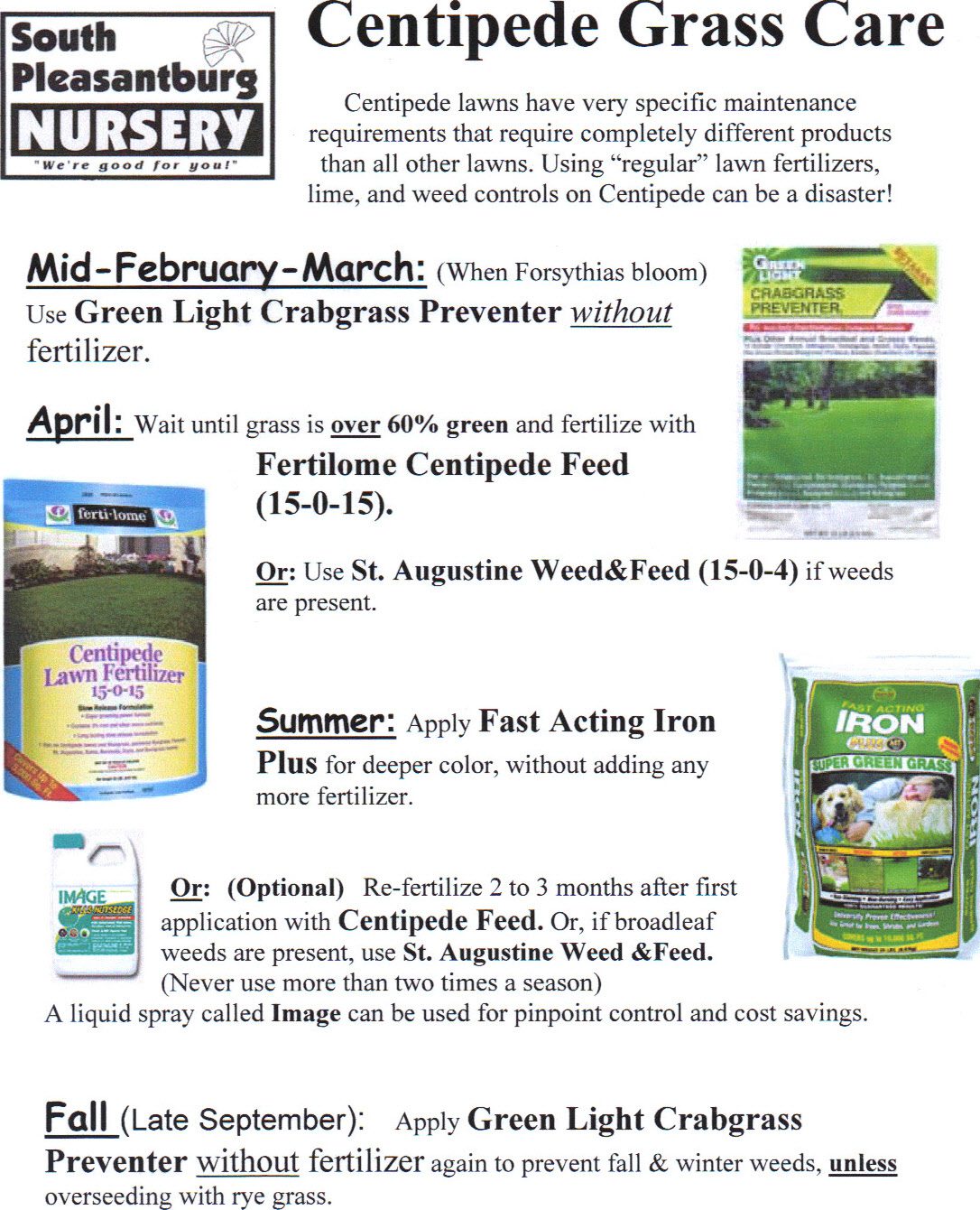 Centipede Grass is a favorite among southerners, here is a sheet to aid in the seemingly complex care cycle of it throughout the season.