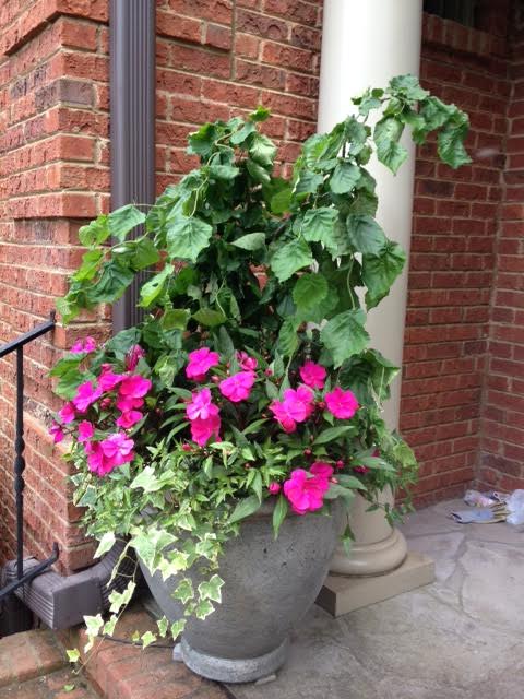 Fantastic assortment of bursting color coming from a fantastic urn. This container was inspired by window boxes in charleston.