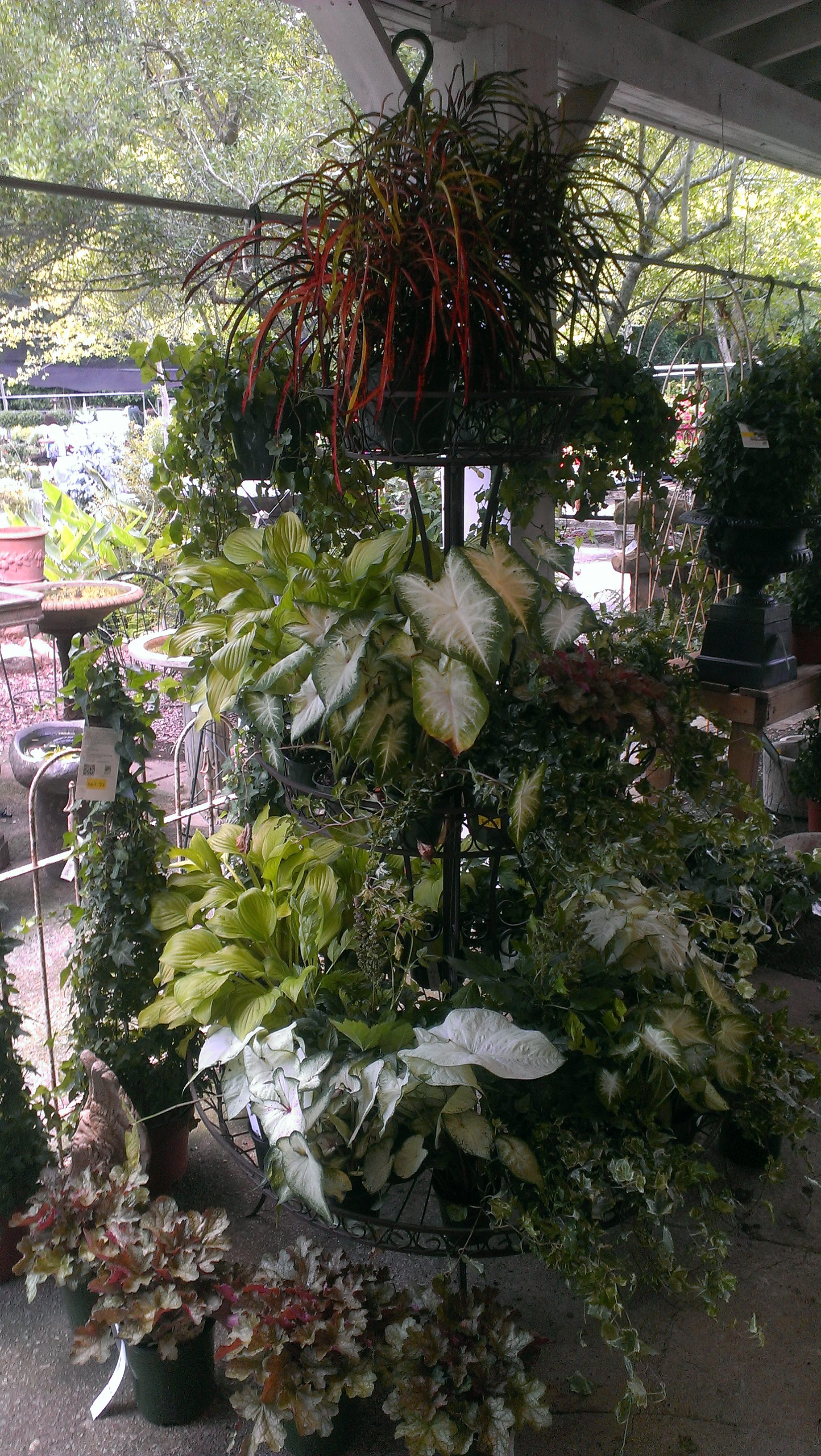 White caladiums are the new white impatien! Since we’ve done away with the old fashioned Impatin due to the mildew, we’ve been racking our brains trying to find a suitable plant that will give just as much color with just as little maintenance. Caladiums flower, but it’s not really special, they really show their stuff through their foliage, not flowers. The upside of this is that they don’t have to be deadheaded and don’t need special fertilizers. These hardy shade lovers will please you up until the last bit of fall. When the temperatures drop, so do these plants, they drop dead. Replace them every year, but think of it as a small investment in months of beauty.