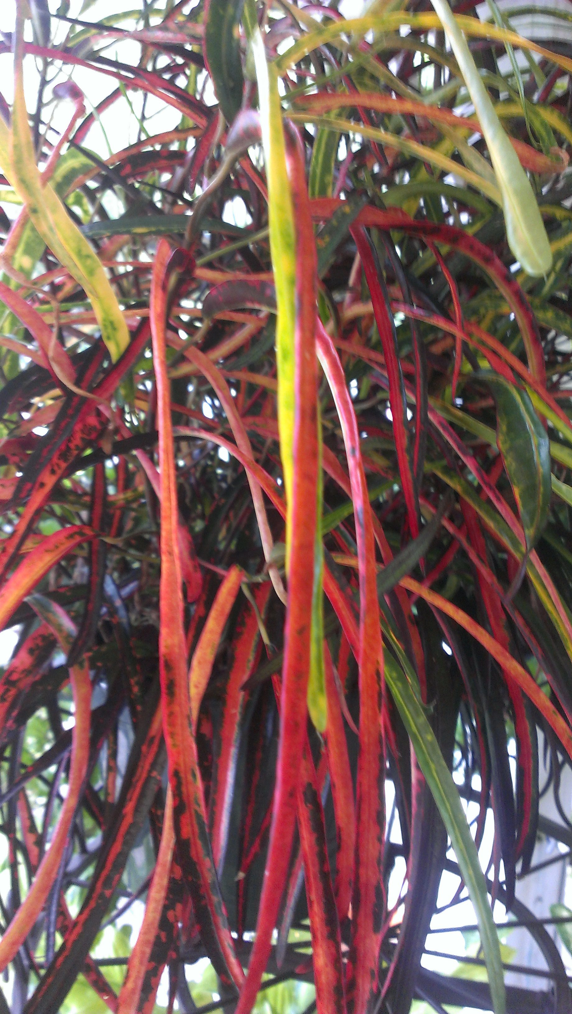 This strap leafed croton is a stunning example of what nature is capable of. Colors ranging from yellow, red, and orange all pop out against a dark green almost black leaf. These are fantastic houseplants in bright locations or could even be used on a covered porch (until it gets cold out). These require little to no special care. Water it once in a while and remove spent leaves to make sure it keeps that lush look!