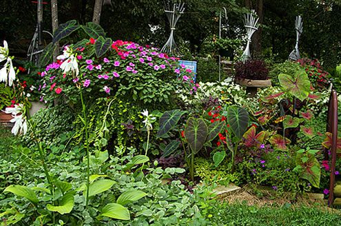 Again, the list isn’t huge for shady hot plants, this is where you can trick the eye by using non plant material to give your garden that extra wow factor. As in the picture above, to create more interest and color, a red chair was added to an otherwise boring perennial bed. Other things can be used as well such as old washboards, fence sections or even an old wheelbarrow!