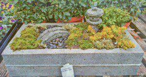 The point behind creating a Trough garden is simple, to replicate a large garden in a very small space. When selecting plant material, visualize an actual garden that you’ve visited or have seen in magazines. Mirror some of the color schemes and textures from that garden in your trough – – for example if you recall a magnificent garden having towering Cryptomeria as a hedge, perhaps you can use a small dwarf Hinoki Cypress instead. Also, if you recall fields of lavender blooming, you can replicate with dwarf creeping phlox to spill over the sides. Use your imagination!